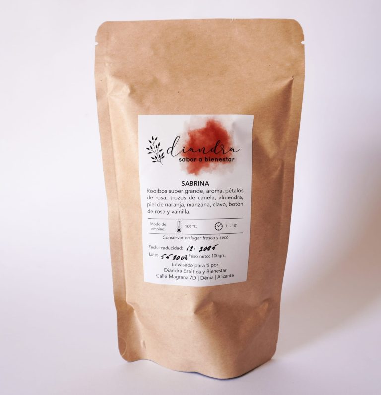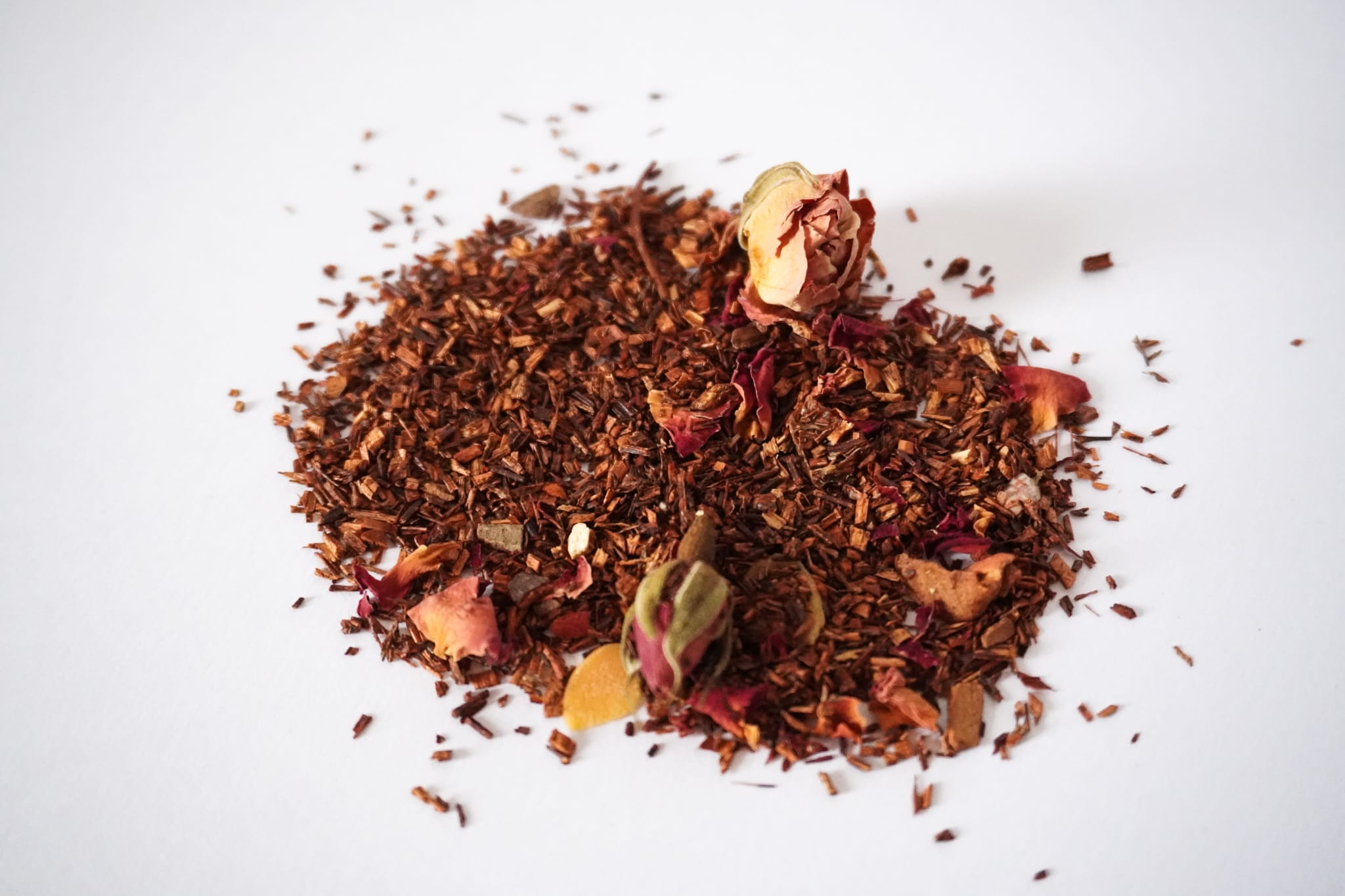 • Ingredientes: Rooibos super grado, aroma, pétalos de rosa, trozos de canela, almendras, piel de naranja, manzana, clavo, botón de rosas y vainilla.